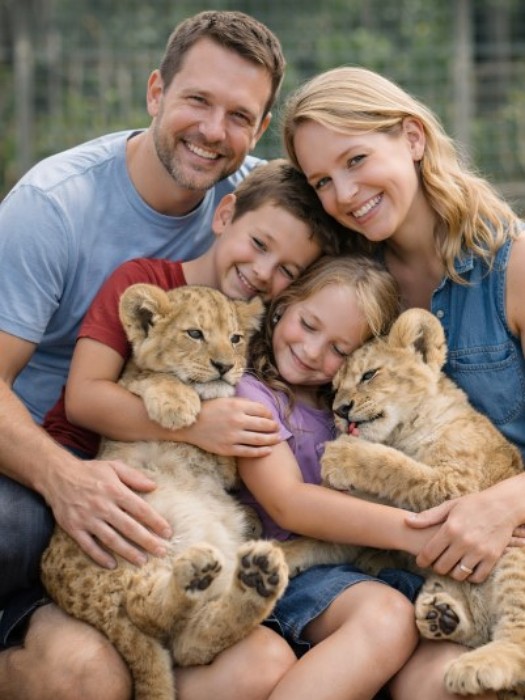 Fotoshootings und direkte Interaktionen (z. B. das Berühren des Löwen) sind optional und können vor Ort im Park gegen Aufpreis gebucht werden.